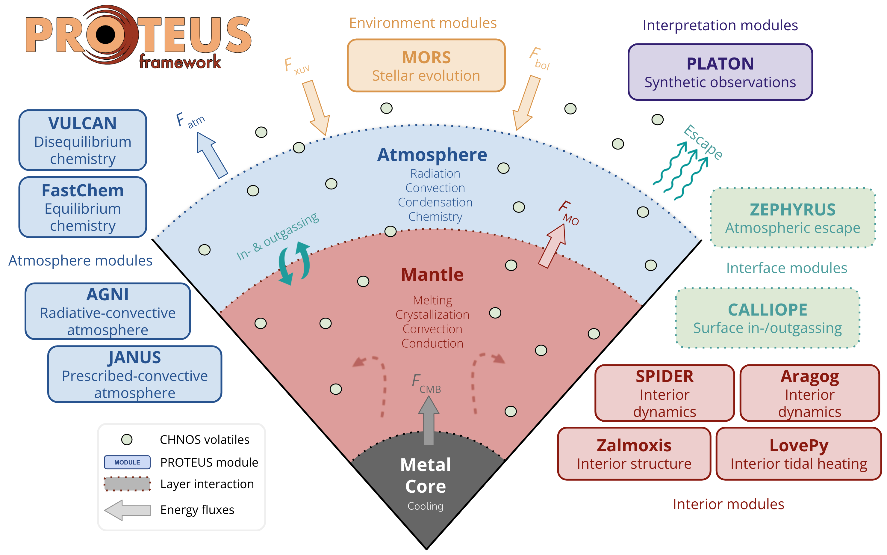 PROTEUS (/ˈproʊtiΙ™s, PROH-tee-Ι™s) is a modular Python framework that simulates the coupled evolution of the atmospheres and interiors of rocky planets and exoplanets. Inspired by the Greek god of elusive sea change, who could change his form at will, PROTEUS is designed to be flexible and adaptable to a wide range of planetary environments. It can foretell the future, but answers only to those who are capable of asking the right questions.