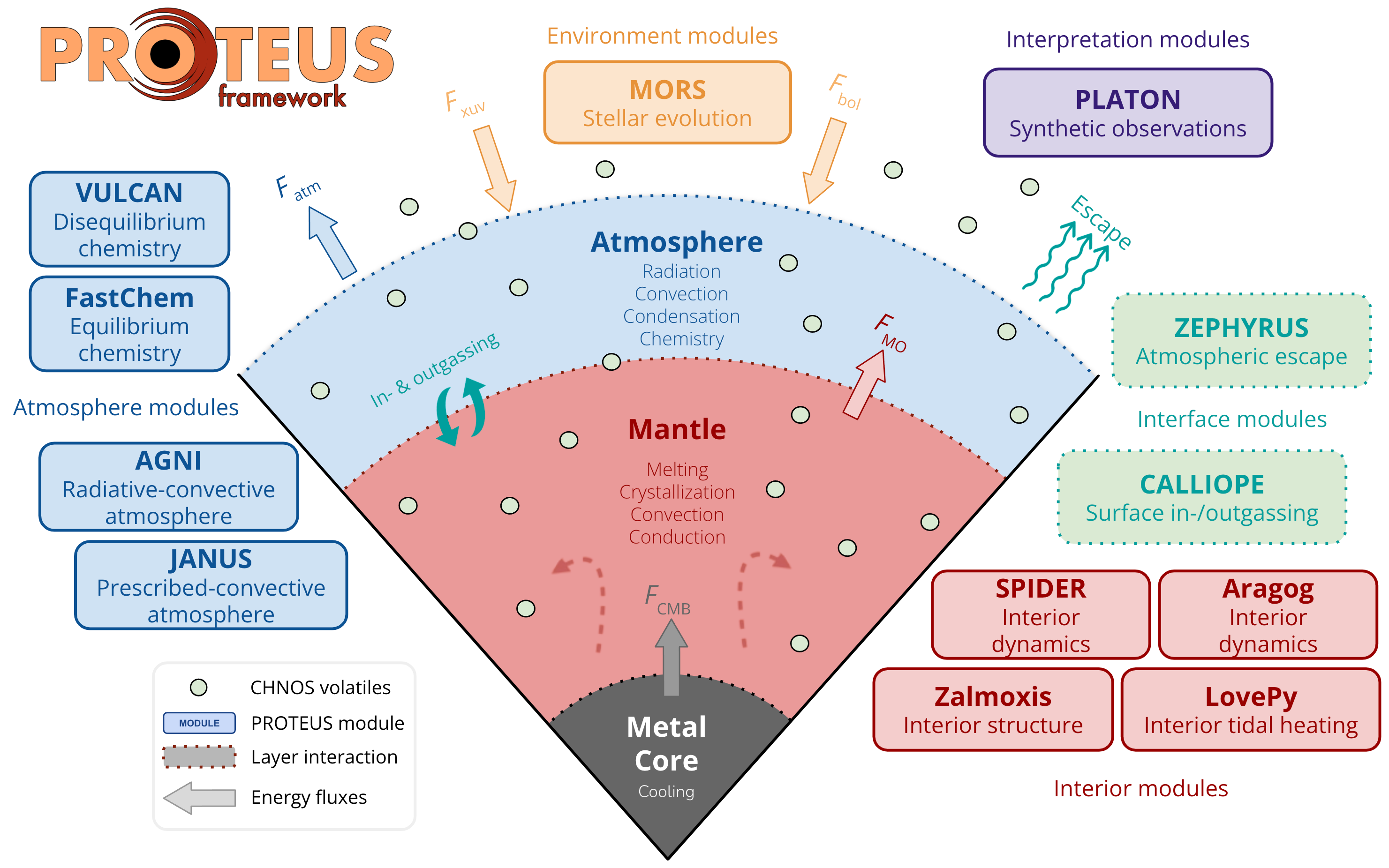 Aragog is the interior evolution module of PROTEUS (/ΛproΚtiΙs, PROH-tee-Ιs), a modular Python framework that simulates the coupled evolution of the atmospheres and interiors of rocky planets and exoplanets. A schematic of PROTEUS components and corresponding modules can be found below.
